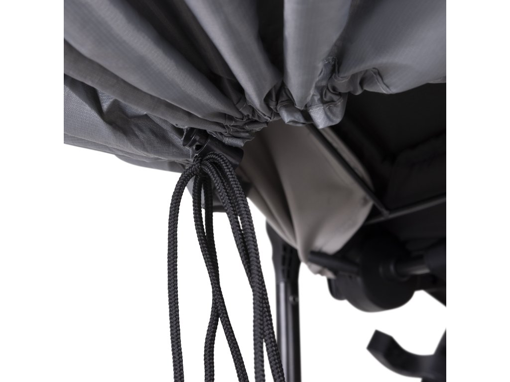 Snadná instalace díky flexibilní šňůře šetří čas a námahu - pláštěnku lze připevnit na vaničku a kočárek v několika krocích a nabízí okamžitou ochranu.