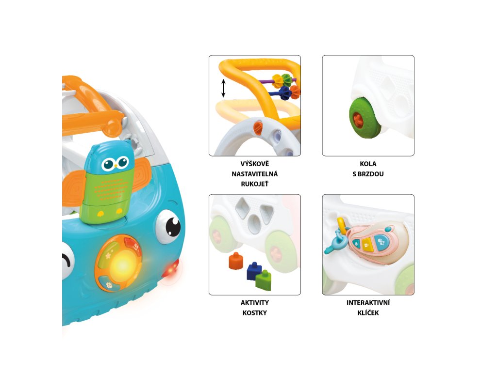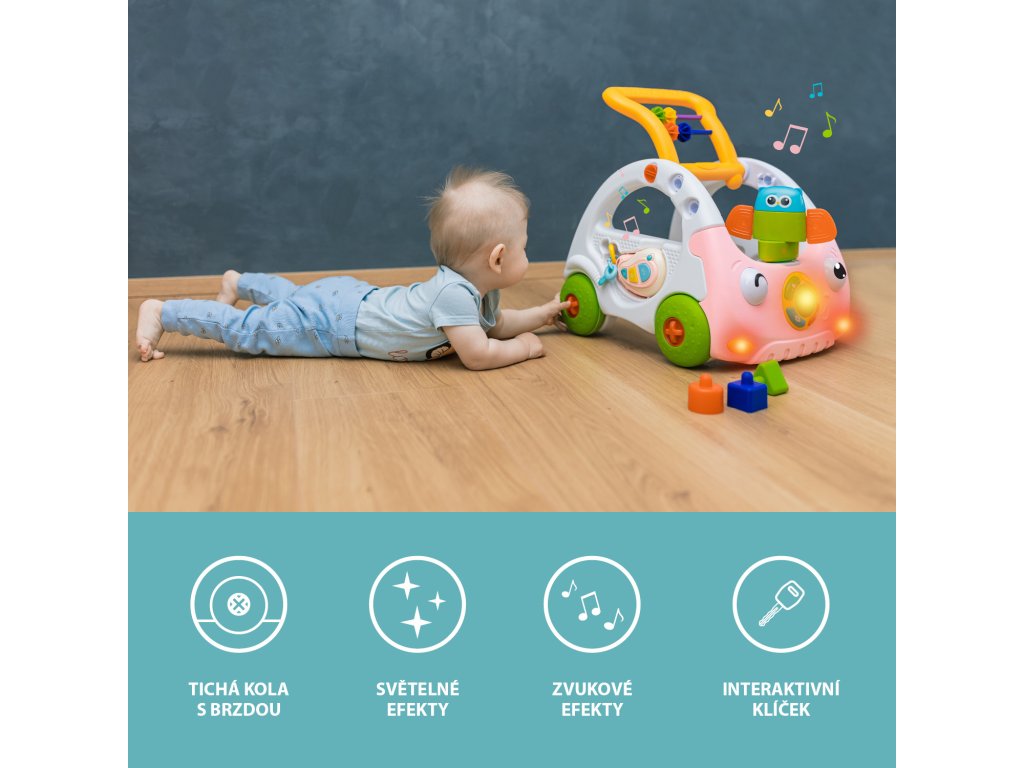 Roztomilé chodítko ve tvaru autíčka bezpečně provede dítě prvními krůčky. Od 6 měsíců slouží jako interaktivní hračka. Na boku chodítka jsou umístěné aktivity kostky, které rozvíjí motoriku a fantazii. Dále je chodítko vybavená skládačkou či počítadlem. Součástí je také interaktivní klíč s tlačítky, díky kterým autíčko vydává zvuky a světelné efekty.