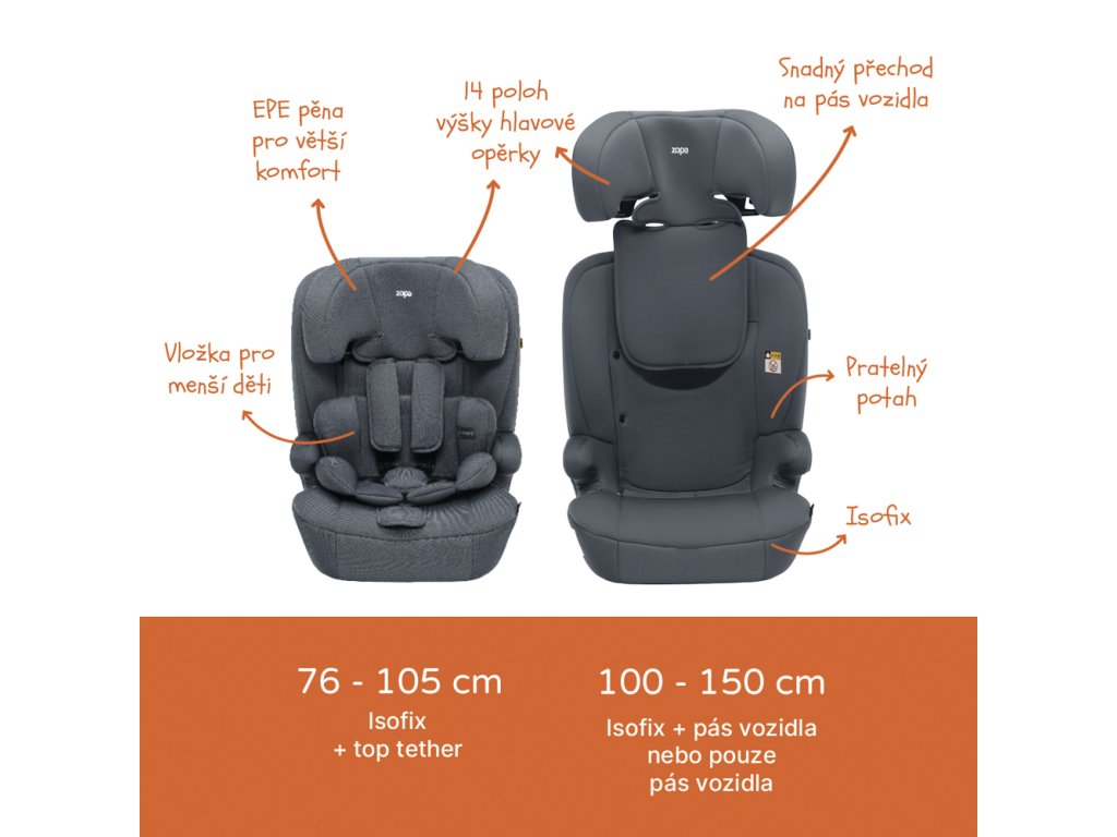 • Dva způsoby instalace: Isofix a Top Tether pro batolata; 3bodový pás pro starší děti.