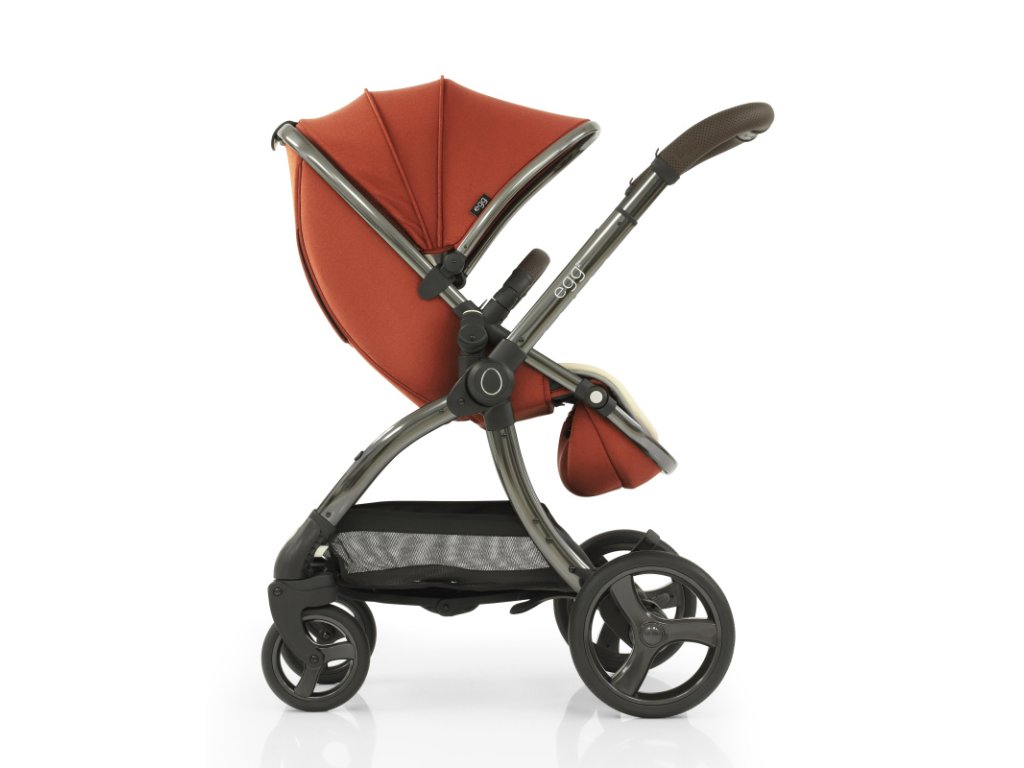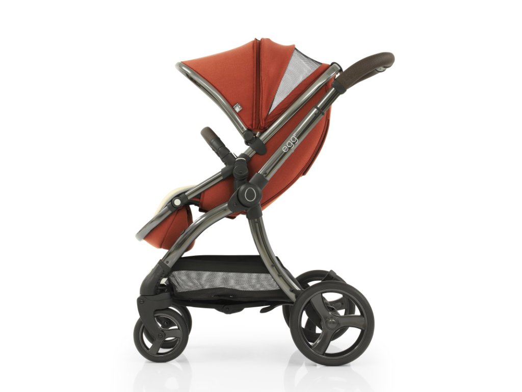 • nová, prostornější sedací část kočárku egg²® je o 7 cm vyšší (délka zádové opěrky je 59 cm) a na podvozku je posazena o 3,6 cm výše, lze ji sklopit do 3 poloh a klasicky nabízí 2 pozice umístění na podvozku – směrem k rodiči nebo čelem do okolí,