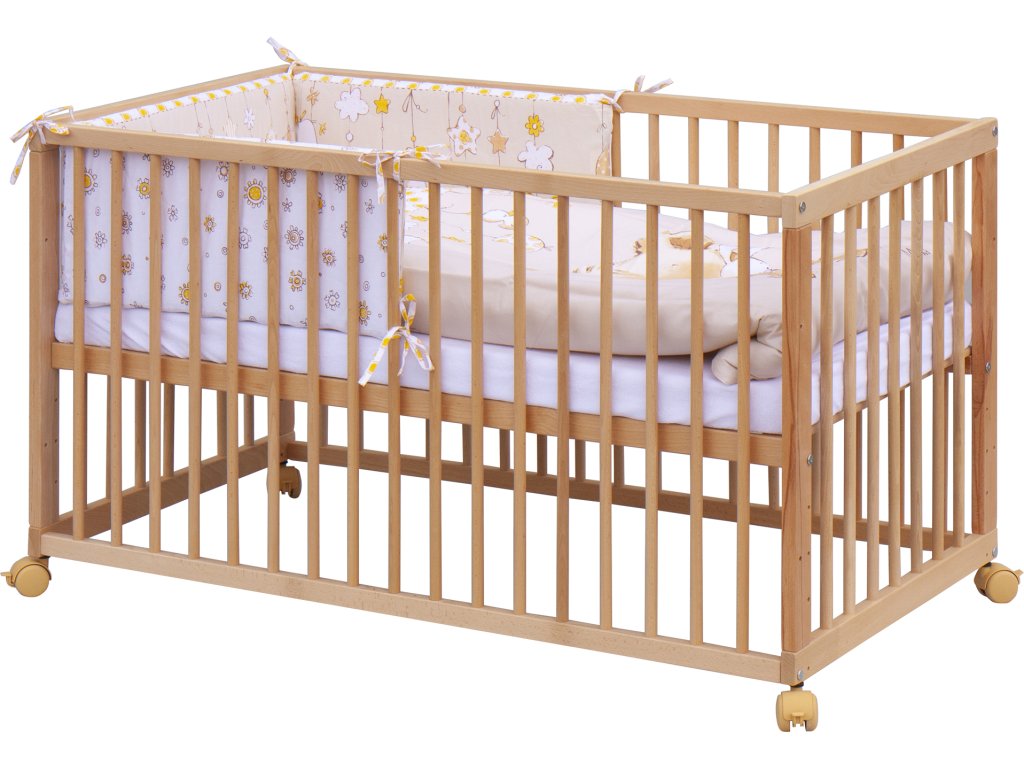 1. Dětská dřevěná postýlka 120 x 60 cm - přírodní, masiv buk, 3 vyndavací příčky, 5 poloh roštu, nohy postýlky jsou předvrtané pro nasazení koleček