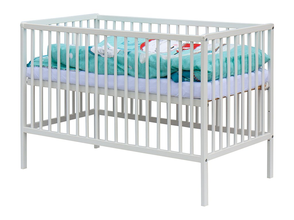 1. Dětská dřevěná postýlka 120x60 cm - bílá, masiv buk, 3 vyndavací příčky, 3 polohy roštu