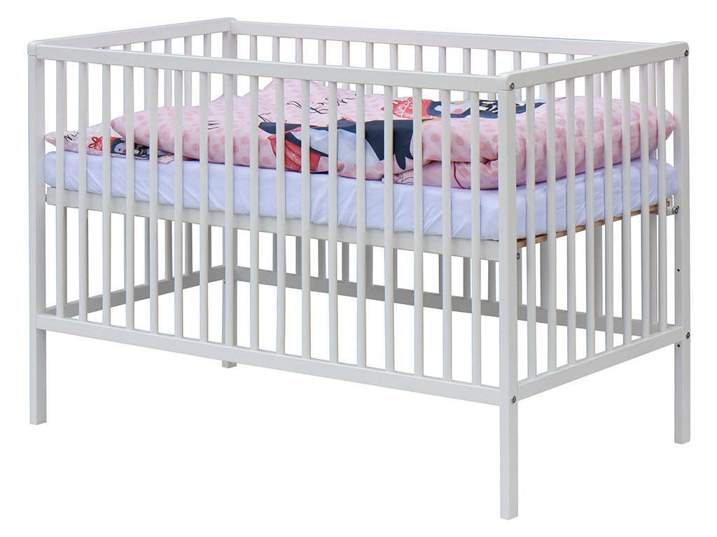 1. Dětská dřevěná postýlka 120x60 cm - bílá, masiv buk, 3 vyndavací příčky, 3 polohy roštu