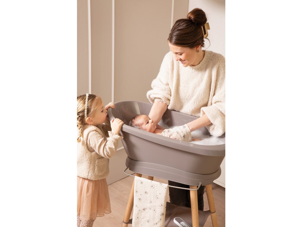 Velmi stabilní vanový stojan Sense má nohy vyrobené z lakovaného bukového dřeva s certifikací FSC. To dodává stojanu teplý moderní vzhled. Je vybaven praktickými pomůckami; vpředu je připevněn držák na ručníky. Prostorná plastová polička poskytuje dostatek místa například pro šampon, žínku, vodní hračky nebo koupací gel. To znamená, že máte po ruce všechny potřebné věci, abyste si s malým mohli v klidu koupání užít. Inovativní systém upevnění zajišťuje, že vanu lze snadno připevnit ke stojanu a stejně snadno sejmout. Po kliknutí můžete své miminko nerušeně a bezpečně koupat.