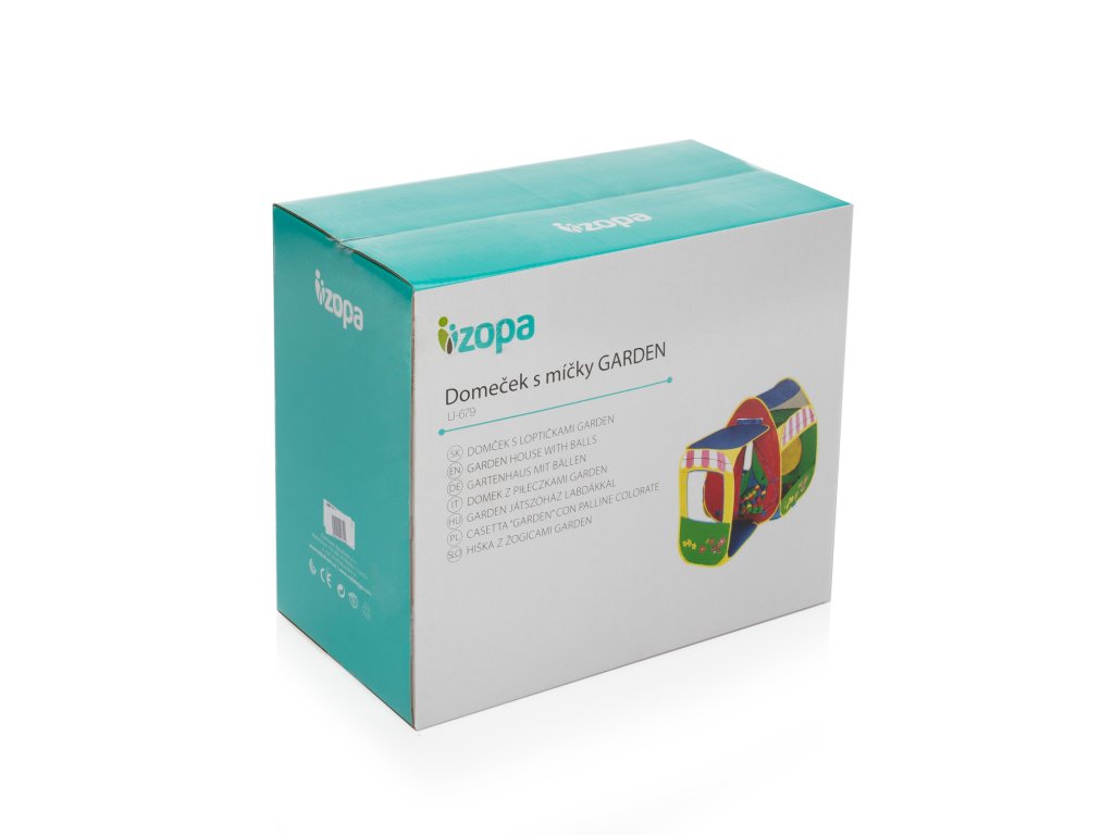 Domeček v designu zahradního stanu s kytičkami. Domek má dvě velká síťovaná okna a část střechy, dvoje dveře a předsíň.