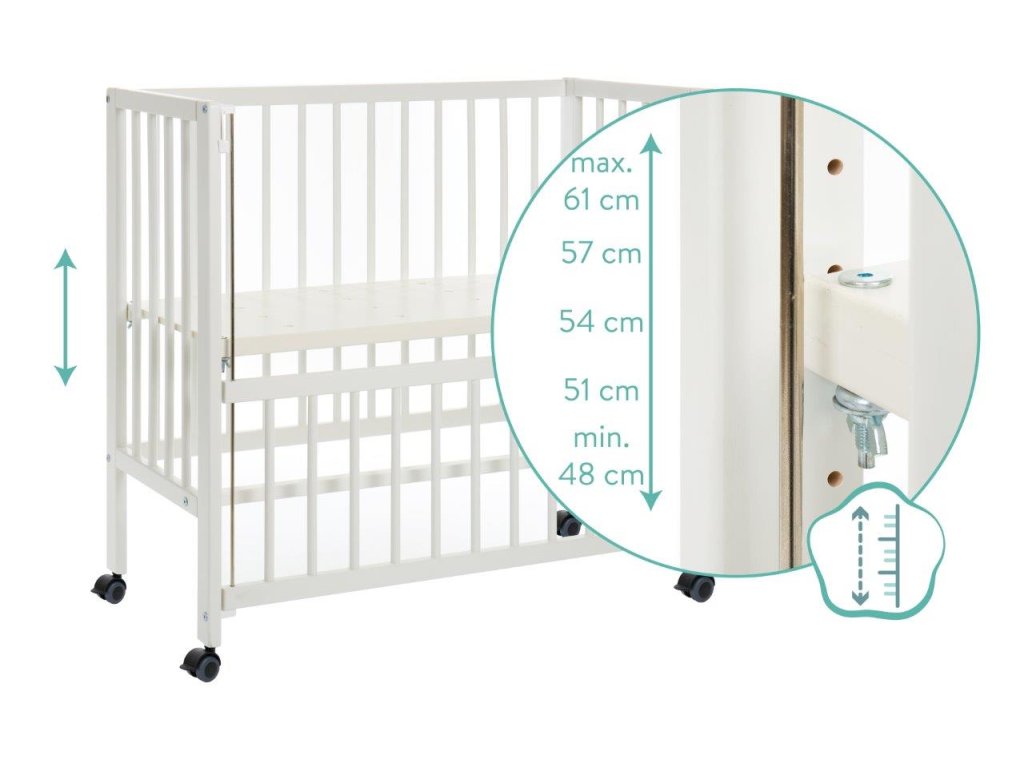 Přes den pak malá postýlka - 90 centimetrů dlouhá a 40 centimetrů široká - na kolečkách rychle odjíždí z cesty až do druhého večera nebo slouží jako společenské lůžko. Popruhy ve své funkci rozkládacího lůžka udržují místo na spaní vašeho dítěte vždy pevně připevněné k velké rodičovské posteli. Snadno se připevňuje bez zanechání zbytků. Odpojení také nezabere téměř žádný čas. Díky čtyřem kolečkům s hladkým chodem může postýlka během dne rychle zmizet v koutě, kde nebude překážet. Pokud ale potřebujete dětskou postýlku i do kuchyně, obývacího pokoje nebo pracovny, jednoduše zavřete otevřenou stranu pomocí integrované posuvné postranice a vytvoříte tak pro nejmenší bezpečné a mobilní denní místo. Ve dne i v noci poskytuje pětipolohová výškově nastavitelná základna vždy potřebnou flexibilitu. Díky otevřeným postranicím a děrovanému roštu má vaše miminko vždy dostatek čerstvého vzduchu a nejsou blokovány zvědavé pohledy do okolí. Masivní bukové dřevo poskytuje potřebnou stabilitu a zároveň zajišťuje dlouhou životnost - i při každodenním pohybu.