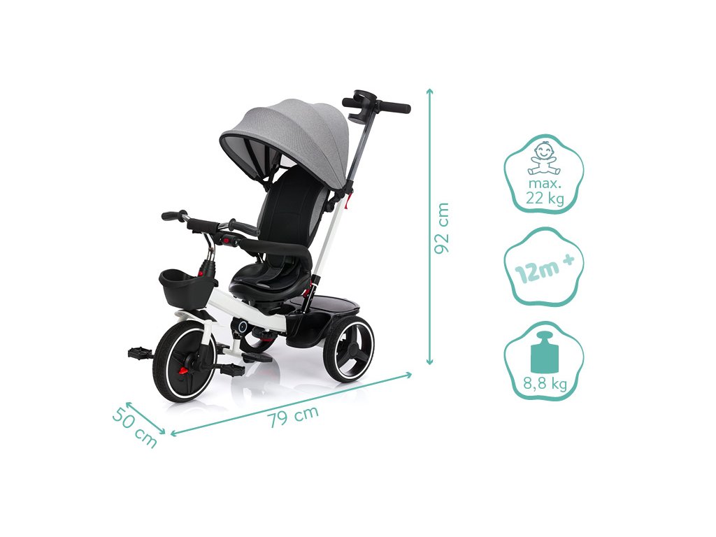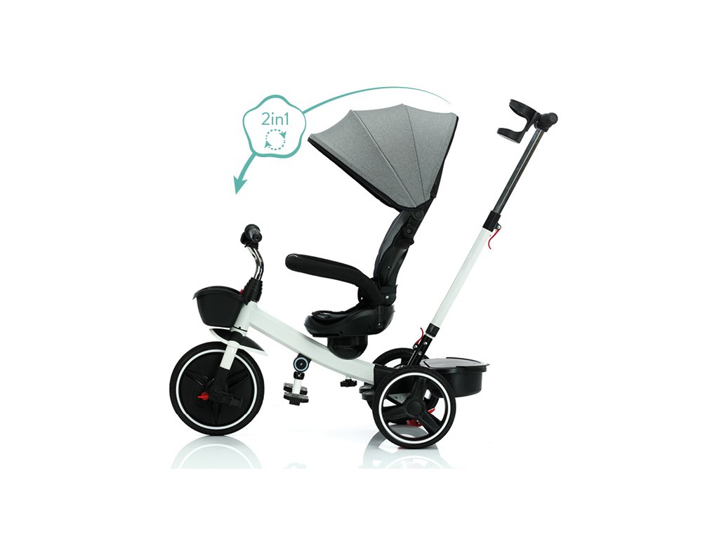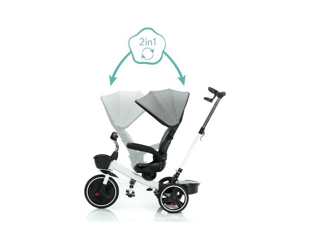 Tříkolka Niki je multifunkčním dopravním prostředkem. Může ji ovládat jak dítě, tak i rodič pomocí nastavitelné vodící tyče. Má otočné sedátko o 360°, což umožňuje dítěti cestovat ve směru nebo proti směru jízdy. Tříkolka má také opěrky nohou pro odlehčení. Sklápěcí stříška chrání před sluncem a větrem. Pro uložení hraček nebo potřeb pro dítě je k dispozici praktický úložný košík vepředu i vzadu.