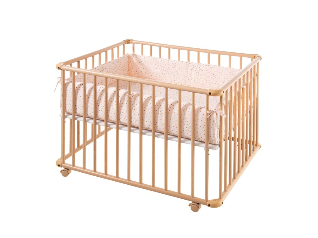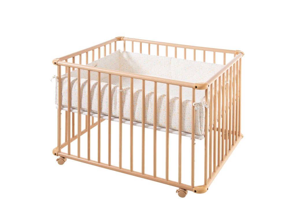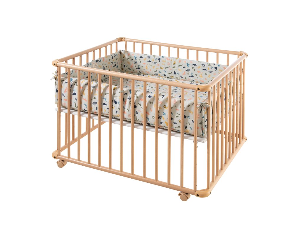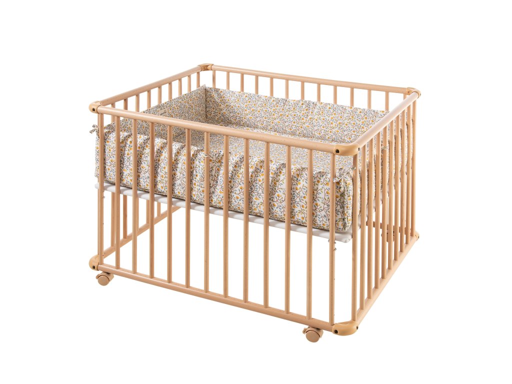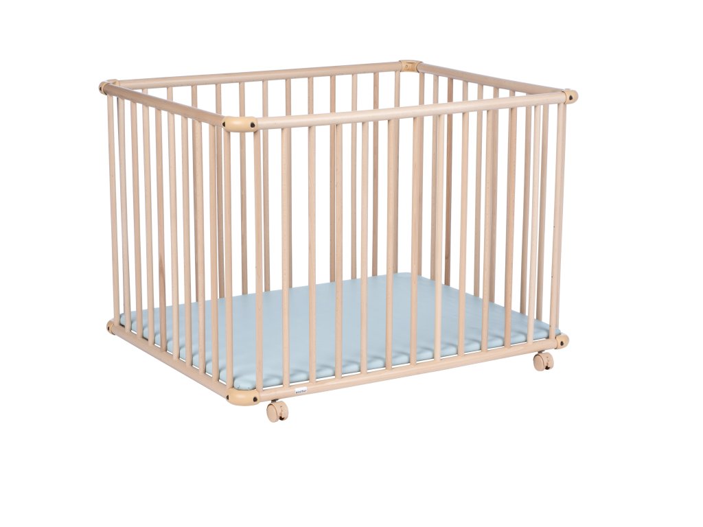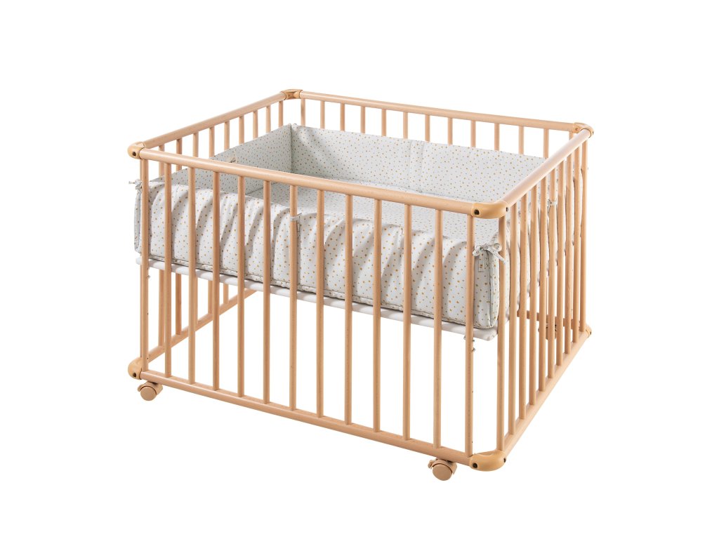 Je vyrobena z masivního bukového dřeva, zaoblené rohové části jsou vyrobeny z odolného plastu. K dispozici je ve 2 velikostech. S menší ohrádkou lze dokonce projet dveřmi, pokud nejsou užší než 80 cm. Všechny použité barvy, tkaniny a další součásti ohrádky jsou odolné vůči slinám a bez škodlivých látek, splňující vysoké standardy požadované pro hračky a dětské výrobky.