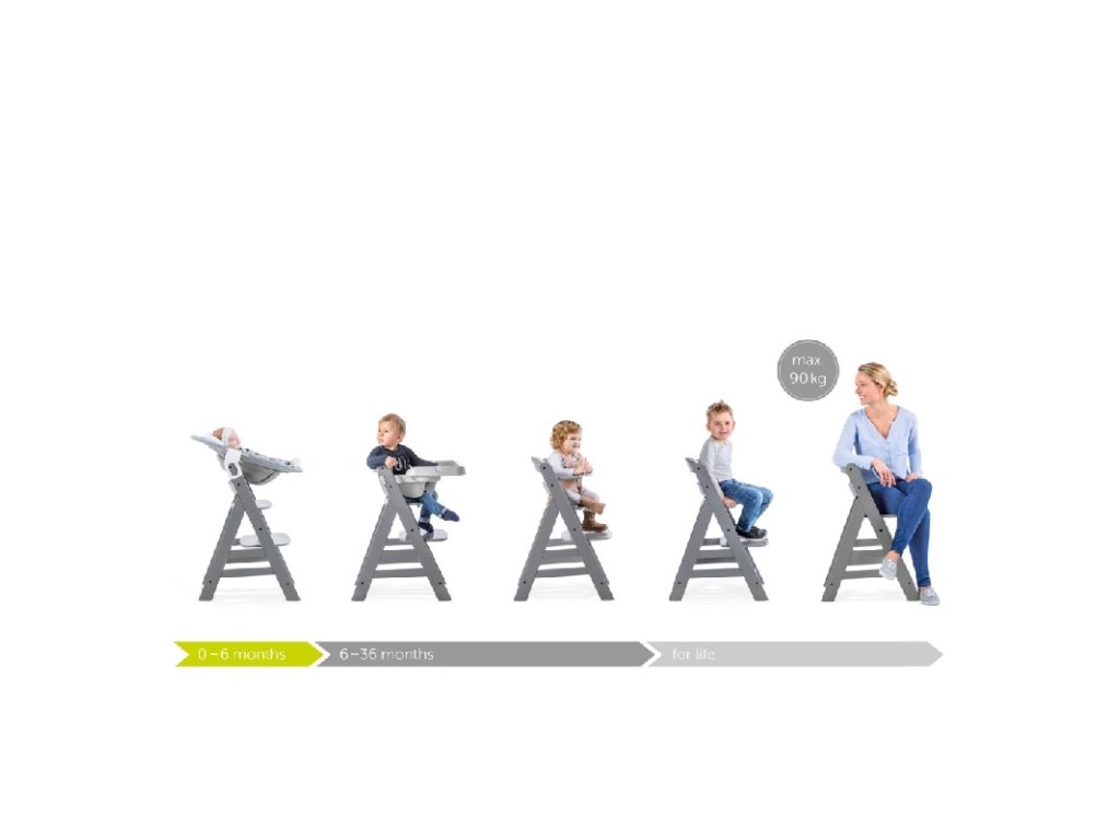 Roste s Vámi celý život // Židlička ALPHA+ je vhodná od cca. 6 měsíců a díky nastavitelnému sedadlu a opěrce nohou roste spolu s dítětem po celý život. Je robustní, její nosnost činí až 90 kg a konstrukčně poskytne maximální stabilitu. Převrhnutí se rozhodně bát nemusíte.