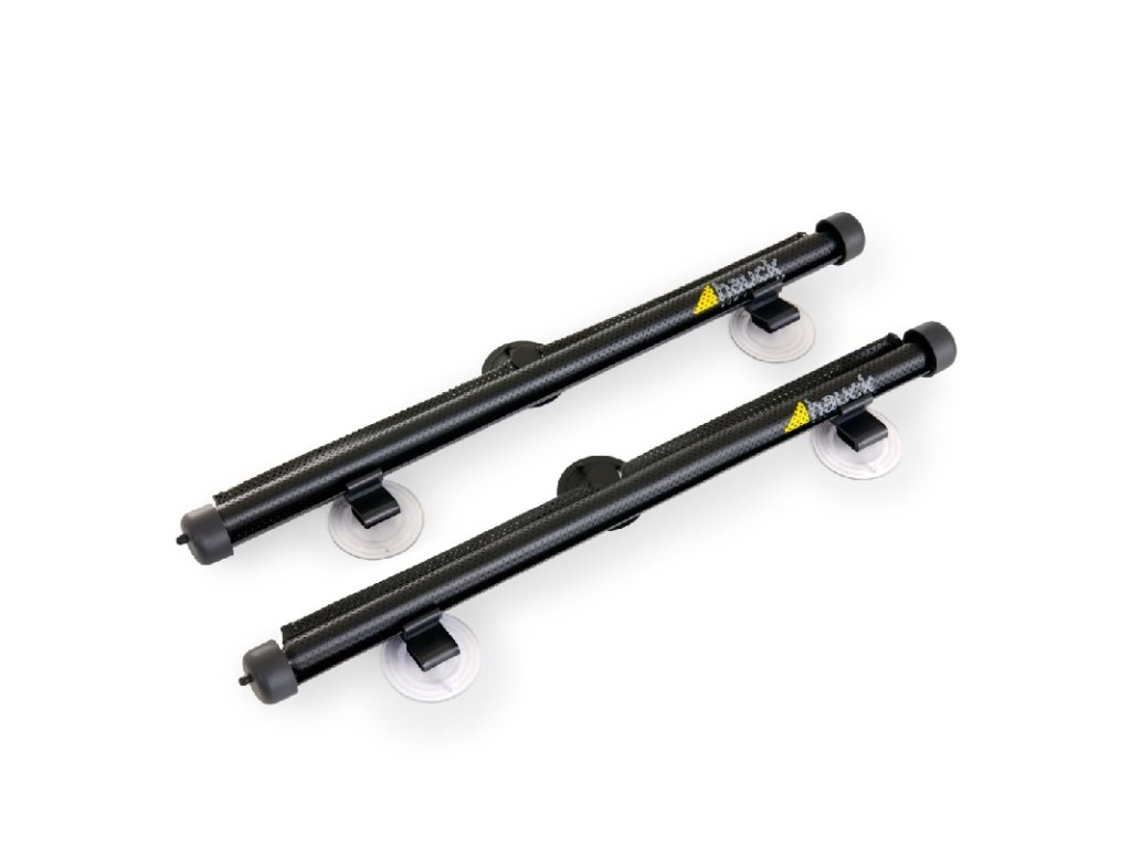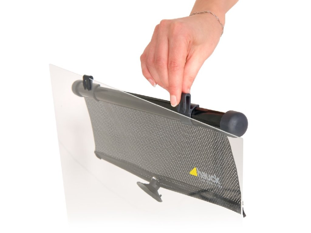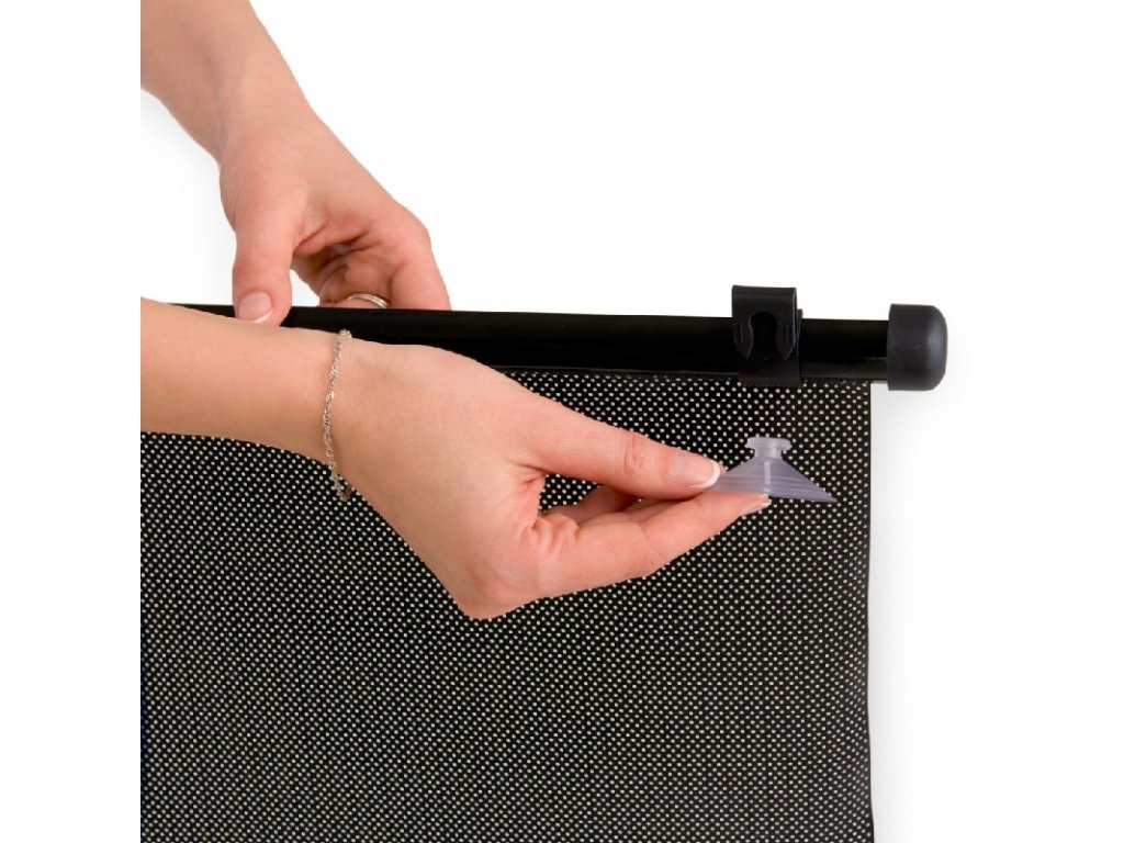 Jednoduché připevnění // Roletu lze připevnit buď pomocí dvou věšáčků s háčkem přímo na okno vozidla, nebo pomocí extra silné přísavky na okenní tabuli. Tato sluneční ochrana se vyroluje zmáčknutím tlačítka po straně vodící lišty. 2 ks v balení.