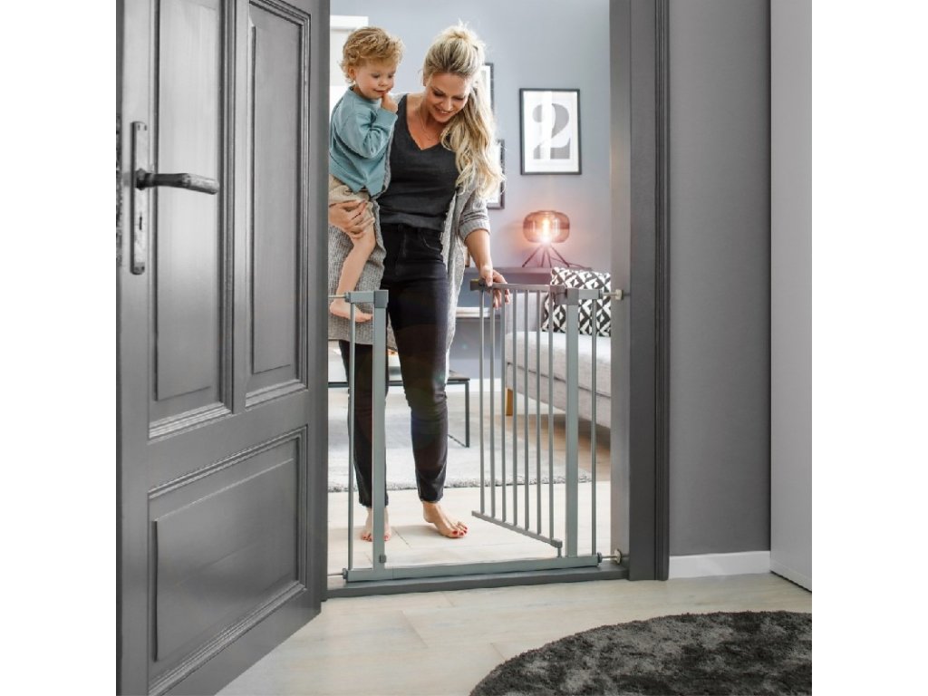 Bezpečnostní pojistka // Díky dvojitému jištění se zamezí nekontrolovatelnému otevření zábrany. Dospělí mohou dveře otevírat jednou rukou do obou směrů.