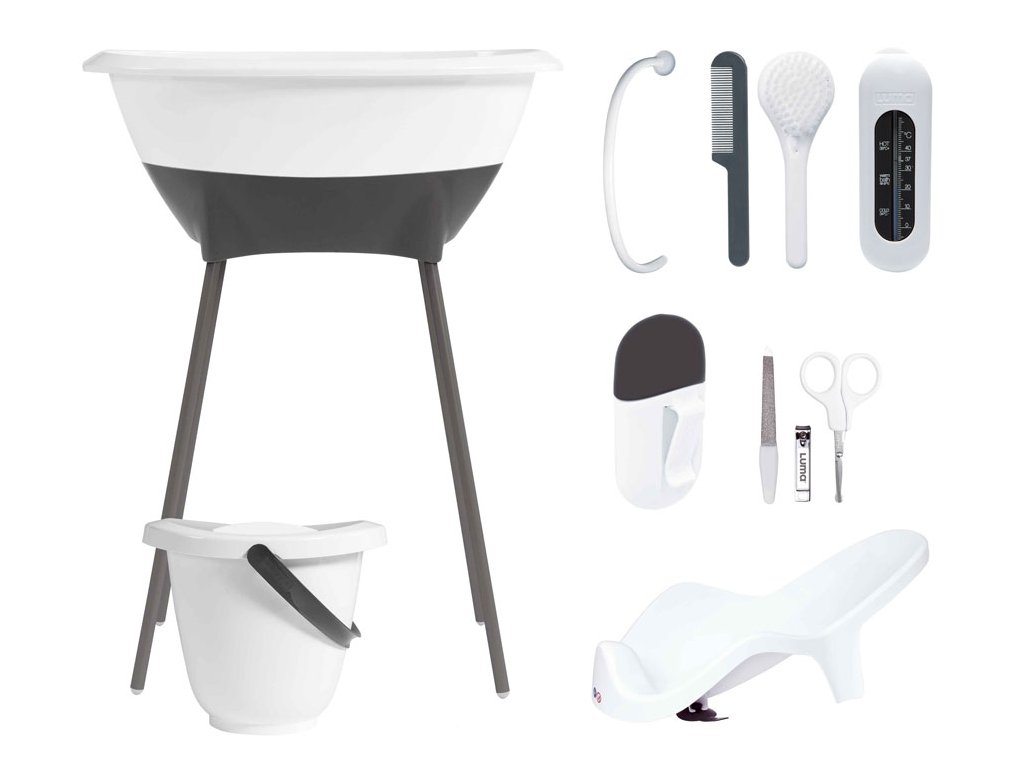 Máte rádi krásné moderní věci a nechcete za ně utratit příliš mnoho peněz? Tak si vyberte LUMU. Sada všech výrobků trendové holandské značky LUMA babycare, které budete ke koupání potřebovat sestává z dětské plastové vaničky, stojanu pod vaničku , kyblíku na pleny s víkem, koupacího lehátka, koupacího teploměru, hřebínku a kartáčku, dětské manikúry a odtokové hadice). Cena sady je zvýhodněná oproti koupi po jednotlivých kusech!