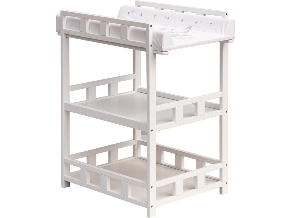 Praktický přebalovací pult se dvěmi policemi z HDF desky. Vrchní přebalovací pult z polyuretanu potažený omyvatelným PVC, vyztužený MDF deskou.