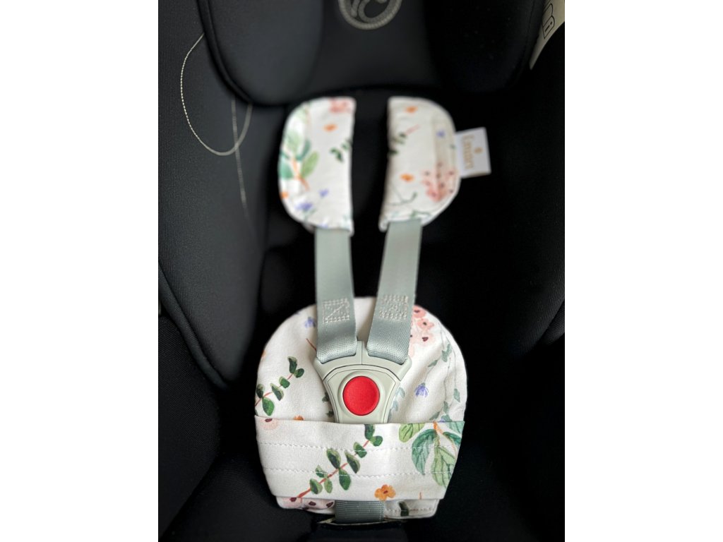 Použití vhodné jak v kočárku, tak v autosedačce. Ramenní polstrování mají suché zipy pro rychlé nasazení, větší polstrování se na sponu autosedačky navléká.