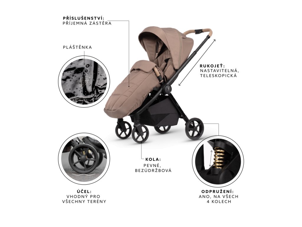 - K soupravě patří také teplý nánožník barevně sladěný s dostupnými možnostmi a deštník. Navíc si můžete dokoupit potah na kočárek, který jej ochrání před poškrábáním a poškozením.