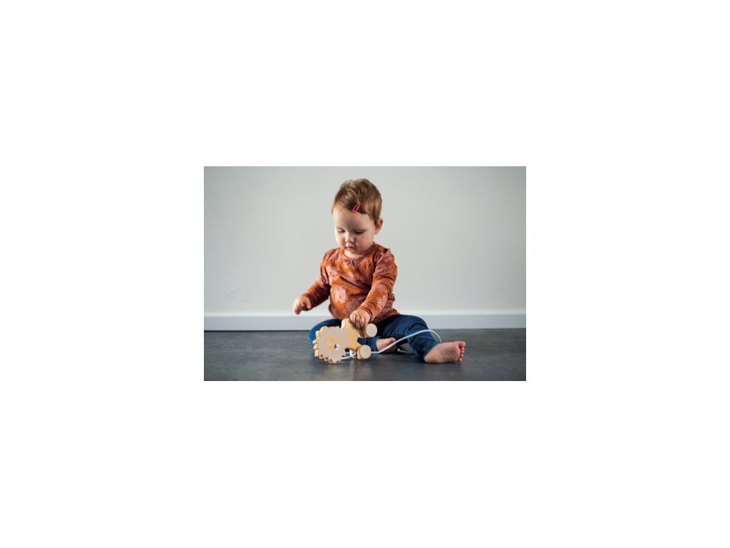 Při hře a procházkách s tímto dřevěným zvířátkem ve tvaru slona si dítě obohacuje svou představivost. Dítě tahá zvířátko za šňůrku.
