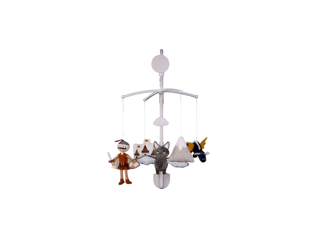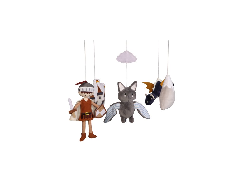 Hudební kolotoč obsahuje 5 plyšových hraček, a to rytíře Kaie z lněné látky, plyšového dráčka Diega, netopýra, hradu a hory. To už je pro vaše děťátko opravdu spousta věcí k objevování a pozorování!